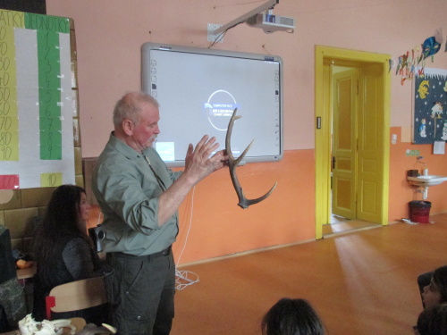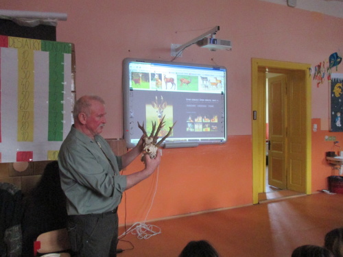 Beseda začala prezentáciou zvierat, ktoré žijú v našom okolí. Pán Habiňák rozprával o ich spôsobe života a podrobne ich opísal. Hovoril o tom, ako lovia svoju korisť, ako a kde prezimujú, ako sa starajú o svoje mláďatá. Zaujímavé bolo aj jeho rozprávanie o vývine parožia srnčej a jelenej zveri. Vysvetlil nám, kedy hovoríme jeleňovi šestorák alebo dvanástorák. Poučil nás, že aj súboje zvierat sú normálnou súčasťou ich života a majú v prírode svoj zmysel. Potom začala prehliadkou trofejí zvierat, žijúcej v okolitej prírode. Mohli sme si prezrieť trofeje srnčej a jelenej zveri. Svoj pútavý výklad pán Habiňák spestril veselými príhodami, ktoré zažili poľovníci na poľovačkách.